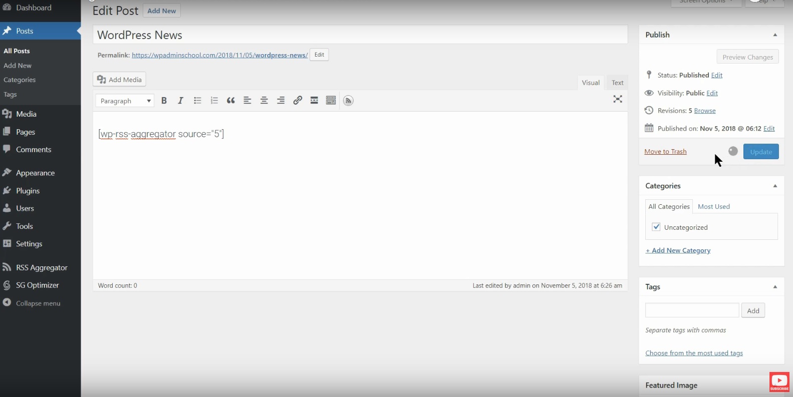 Okay, so the next step after creating an RSS feed is to add it to your posts or pages. You can go to the text editor of a specific post, and you’ll see an icon labeled “WP RSS Aggregator Shortcode” there. After clicking it, you can select a given feed and add it as a shortcode. Here’s what it looks like once you save the page.